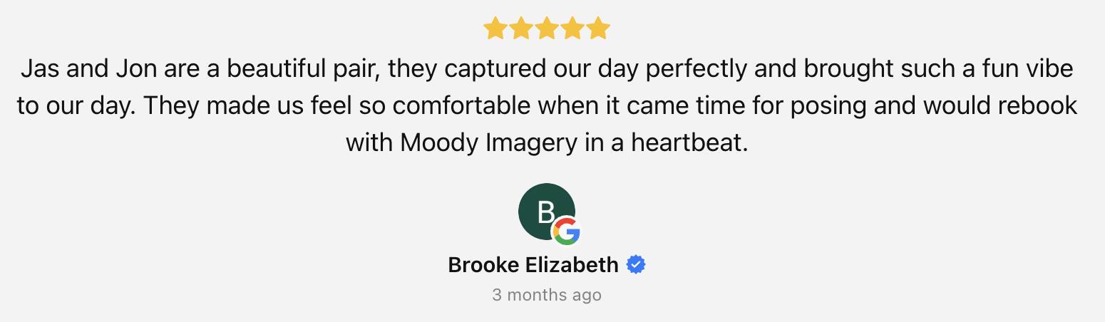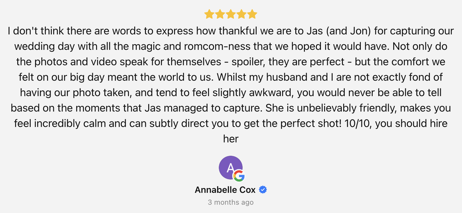 We work with people who care about the energy of the day - good music, great food, and everyone having the time of their lives. We're not just there to take photos, we're there to experience it with you. You'll find us dancing on the floor, tearing up during speeches, and genuinely invested in making sure you have the best day possible.